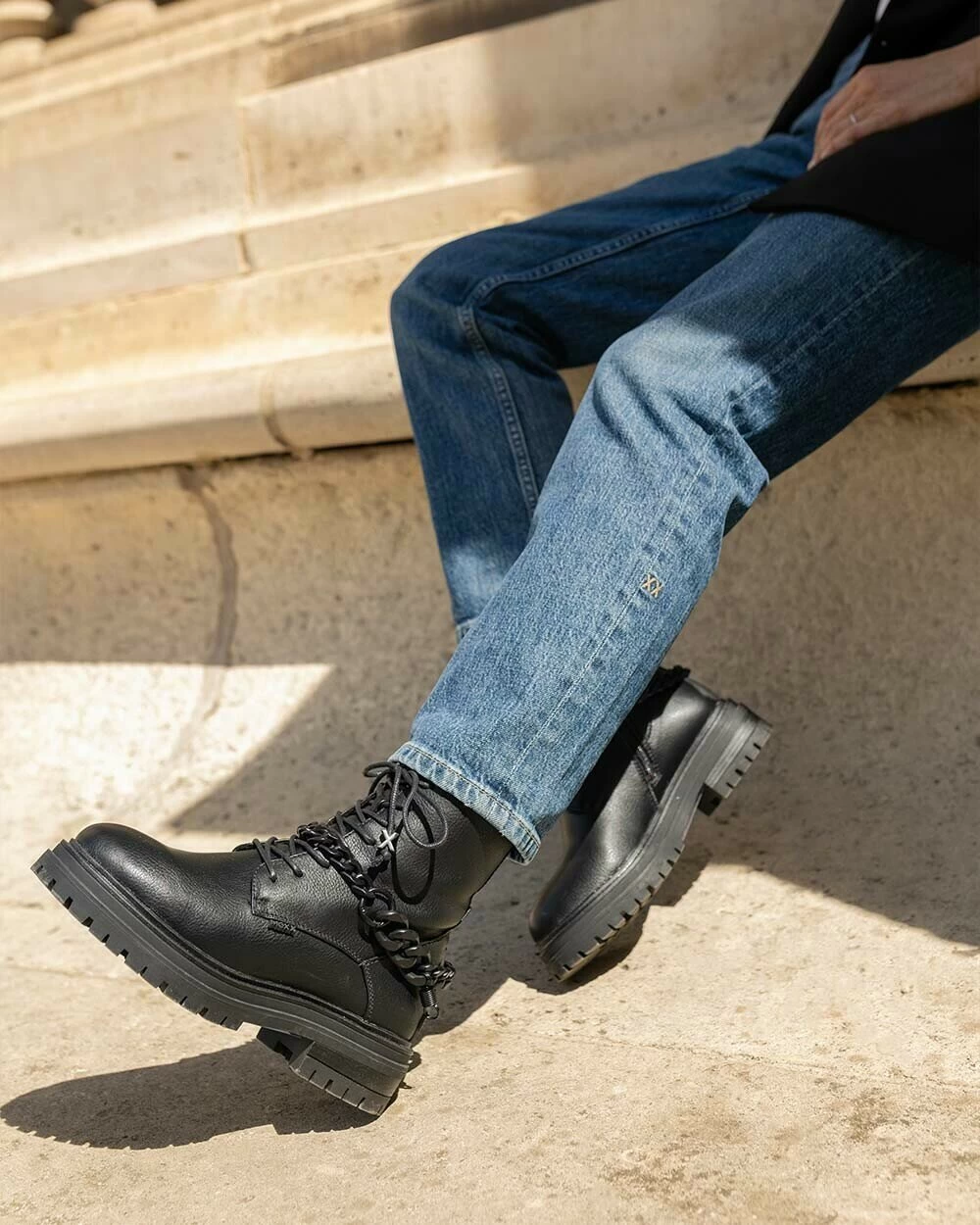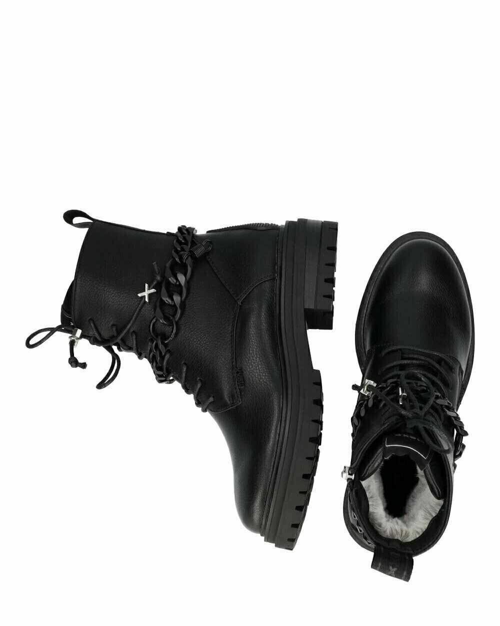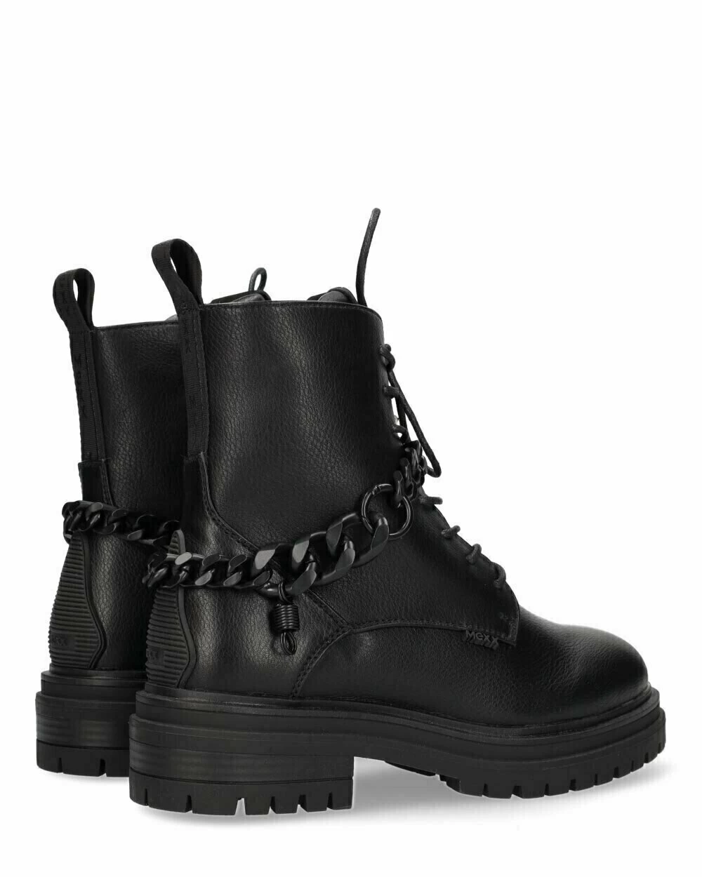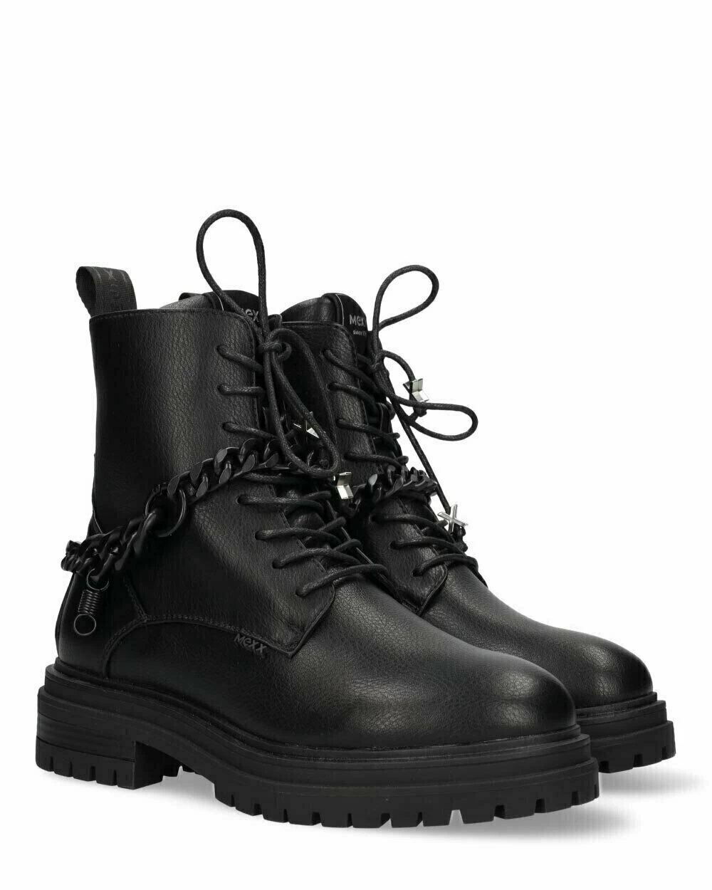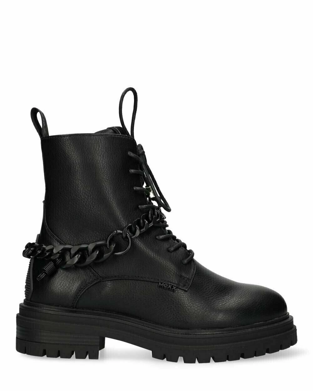 Gave zwarte enkellaars voor dames van Mexx. Deze stoere bikerboot heeft gave details zoals een ketting om de enkel, rubberen merkdetails en metalen bedels aan de veters. De laars heeft een rits in de binnenkant. De zool is een stevige profielzool. Alle laarsjes hebben een matching ketting met matching buckles. Daarnaast zit er in de doos nog een versie van de buckles. Hiermee kan jij deze accessoires afwisselen. Spuit de schoenen regelmatig in tegen water en vuil.